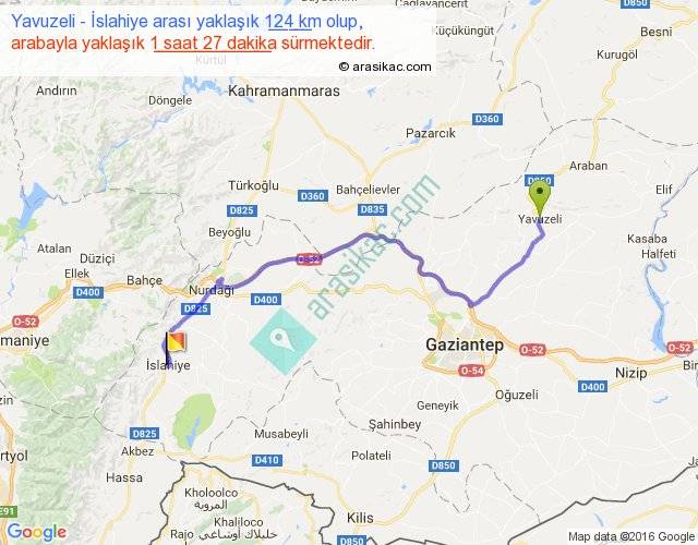 Yavuzeli - İslahiye arası yaklaşık olarak 90 km/h ile yukarıda belirtilen sürede olup, iki yerin kuş uçuşu uzaklığı (mesafesi) 89'dir. Yolculuk otobüsle 1 saat 53 dakika sürmektedir.