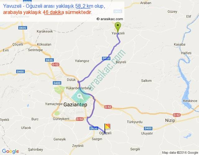 Yavuzeli - Oğuzeli arası yaklaşık olarak 90 km/h ile yukarıda belirtilen sürede olup, iki yerin kuş uçuşu uzaklığı (mesafesi) 39'dir. Yolculuk otobüsle 59 dakika sürmektedir.