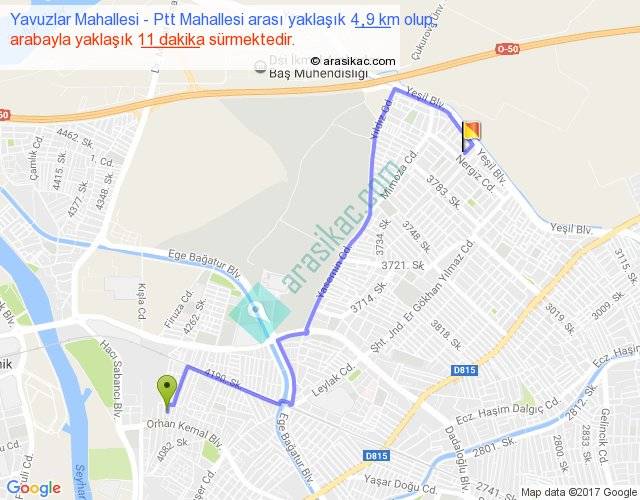 Yavuzlar Mahallesi - Ptt Mahallesi arası yaklaşık olarak 90 km/h ile yukarıda belirtilen sürede olup, iki yerin kuş uçuşu uzaklığı (mesafesi) 3'dir. Yolculuk otobüsle 14 dakika sürmektedir.