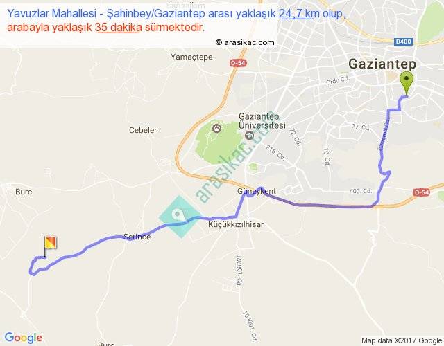 Yavuzlar Mahallesi - Şahinbey Gaziantep arası yaklaşık olarak 90 km/h ile yukarıda belirtilen sürede olup, iki yerin kuş uçuşu uzaklığı (mesafesi) 17'dir. Yolculuk otobüsle 45 dakika sürmektedir.