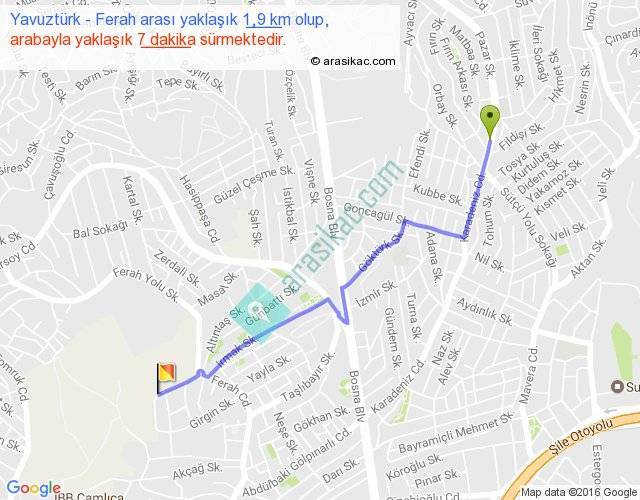 Yavuztürk - Ferah arası yaklaşık olarak 90 km/h ile yukarıda belirtilen sürede olup, iki yerin kuş uçuşu uzaklığı (mesafesi) 1'dir. Yolculuk otobüsle 9 dakika sürmektedir.