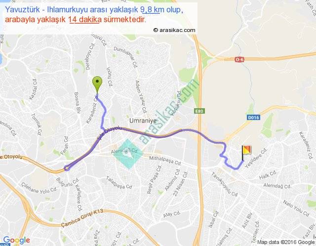 Yavuztürk - Ihlamurkuyu arası yaklaşık olarak 90 km/h ile yukarıda belirtilen sürede olup, iki yerin kuş uçuşu uzaklığı (mesafesi) 5'dir. Yolculuk otobüsle 18 dakika sürmektedir.