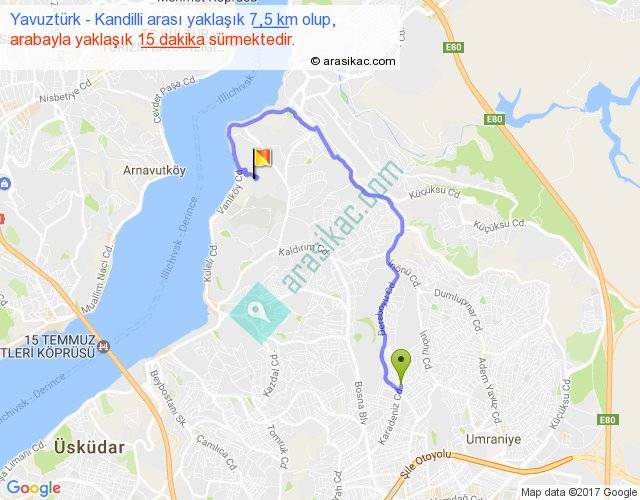 Yavuztürk - Kandilli arası yaklaşık olarak 90 km/h ile yukarıda belirtilen sürede olup, iki yerin kuş uçuşu uzaklığı (mesafesi) 4'dir. Yolculuk otobüsle 19 dakika sürmektedir.