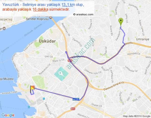 Yavuztürk - Selimiye arası yaklaşık olarak 90 km/h ile yukarıda belirtilen sürede olup, iki yerin kuş uçuşu uzaklığı (mesafesi) 7'dir. Yolculuk otobüsle 20 dakika sürmektedir.
