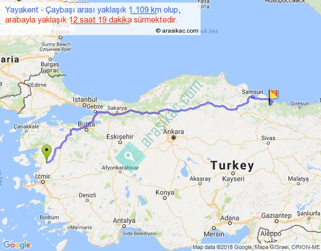Yayakent - Çaybaşı arası yaklaşık olarak 90 km/h ile yukarıda belirtilen sürede olup, iki yerin kuş uçuşu uzaklığı (mesafesi) 855'dir. Eğer belirtilen yerler arasında uçak seferi var ise bu süre uçakla 1 saat 18 dakika'ya kadar düşebilir. Yolculuk otobüsle 16 saat 0 dakika sürmektedir.