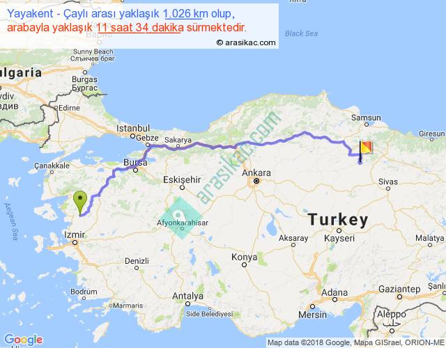 Yayakent - Çaylı arası yaklaşık olarak 90 km/h ile yukarıda belirtilen sürede olup, iki yerin kuş uçuşu uzaklığı (mesafesi) 766'dir. Eğer belirtilen yerler arasında uçak seferi var ise bu süre uçakla 1 saat 10 dakika'ya kadar düşebilir. Yolculuk otobüsle 15 saat 2 dakika sürmektedir.
