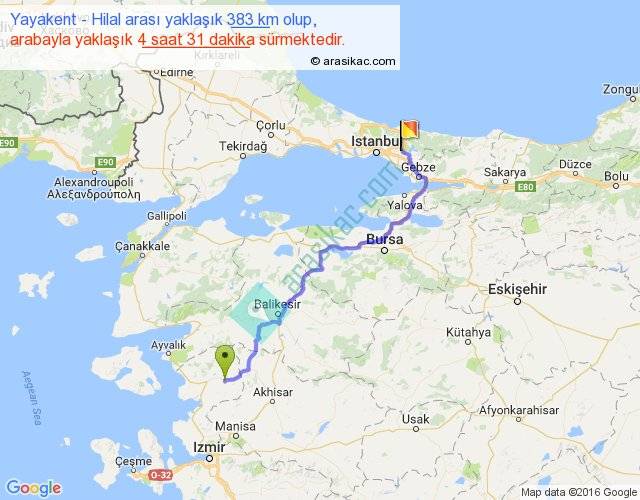 Yayakent - Hilal arası yaklaşık olarak 90 km/h ile yukarıda belirtilen sürede olup, iki yerin kuş uçuşu uzaklığı (mesafesi) 270'dir. Eğer belirtilen yerler arasında uçak seferi var ise bu süre uçakla 24 dakika'ya kadar düşebilir. Yolculuk otobüsle 5 saat 52 dakika sürmektedir.