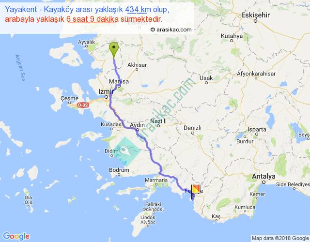 Yayakent - Kayaköy arası yaklaşık olarak 90 km/h ile yukarıda belirtilen sürede olup, iki yerin kuş uçuşu uzaklığı (mesafesi) 318'dir. Eğer belirtilen yerler arasında uçak seferi var ise bu süre uçakla 29 dakika'ya kadar düşebilir. Yolculuk otobüsle 7 saat 59 dakika sürmektedir.