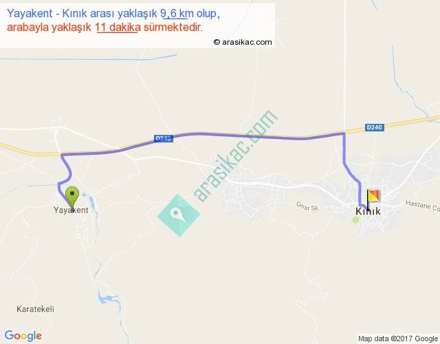 Yayakent - Kınık arası yaklaşık olarak 90 km/h ile yukarıda belirtilen sürede olup, iki yerin kuş uçuşu uzaklığı (mesafesi) 6'dir. Yolculuk otobüsle 14 dakika sürmektedir.