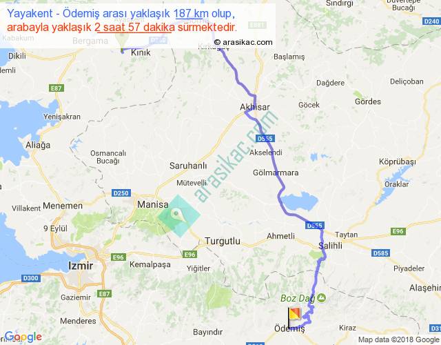 Yayakent - Ödemiş arası yaklaşık olarak 90 km/h ile yukarıda belirtilen sürede olup, iki yerin kuş uçuşu uzaklığı (mesafesi) 111'dir. Yolculuk otobüsle 3 saat 50 dakika sürmektedir.