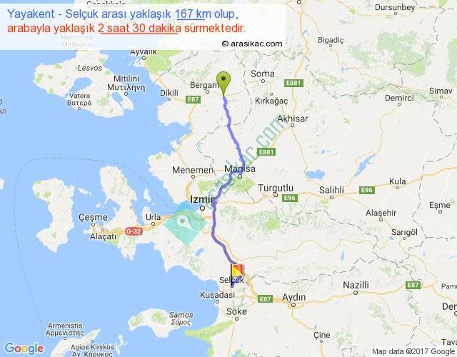 Yayakent - Selçuk arası yaklaşık olarak 90 km/h ile yukarıda belirtilen sürede olup, iki yerin kuş uçuşu uzaklığı (mesafesi) 126'dir. Yolculuk otobüsle 3 saat 15 dakika sürmektedir.