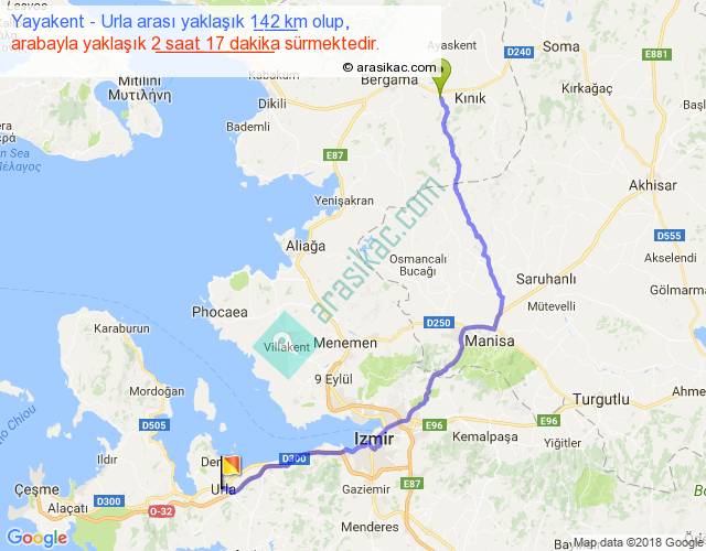 Yayakent - Urla arası yaklaşık olarak 90 km/h ile yukarıda belirtilen sürede olup, iki yerin kuş uçuşu uzaklığı (mesafesi) 96'dir. Yolculuk otobüsle 2 saat 58 dakika sürmektedir.