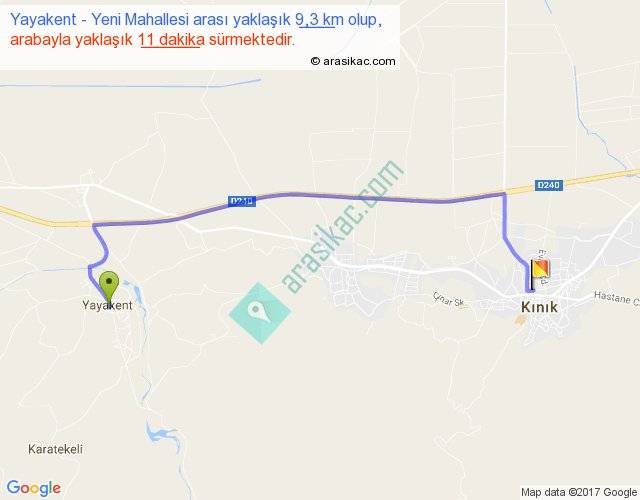 Yayakent - Yeni Mahallesi arası yaklaşık olarak 90 km/h ile yukarıda belirtilen sürede olup, iki yerin kuş uçuşu uzaklığı (mesafesi) 6'dir. Yolculuk otobüsle 14 dakika sürmektedir.