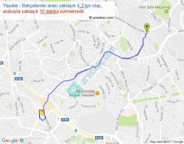 Yayalar - Bahçelievler arası yaklaşık olarak 90 km/h ile yukarıda belirtilen sürede olup, iki yerin kuş uçuşu uzaklığı (mesafesi) 3'dir. Yolculuk otobüsle 13 dakika sürmektedir.