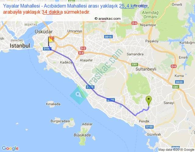 Yayalar Mahallesi - Acıbadem Mahallesi arası yaklaşık olarak 90 km/h ile yukarıda belirtilen sürede olup, iki yerin kuş uçuşu uzaklığı (mesafesi) 22'dir. Yolculuk otobüsle 44 dakika sürmektedir.