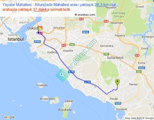 Yayalar Mahallesi - Altunizade Mahallesi arası yaklaşık olarak 90 km/h ile yukarıda belirtilen sürede olup, iki yerin kuş uçuşu uzaklığı (mesafesi) 23'dir. Yolculuk otobüsle 48 dakika sürmektedir.