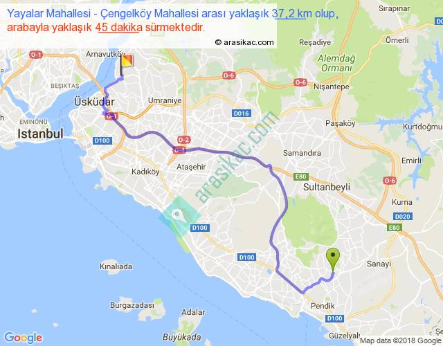 Yayalar Mahallesi - Çengelköy Mahallesi arası yaklaşık olarak 90 km/h ile yukarıda belirtilen sürede olup, iki yerin kuş uçuşu uzaklığı (mesafesi) 24'dir. Yolculuk otobüsle 58 dakika sürmektedir.