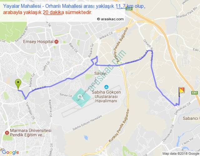 Yayalar Mahallesi - Orhanlı Mahallesi arası yaklaşık olarak 90 km/h ile yukarıda belirtilen sürede olup, iki yerin kuş uçuşu uzaklığı (mesafesi) 7'dir. Yolculuk otobüsle 26 dakika sürmektedir.