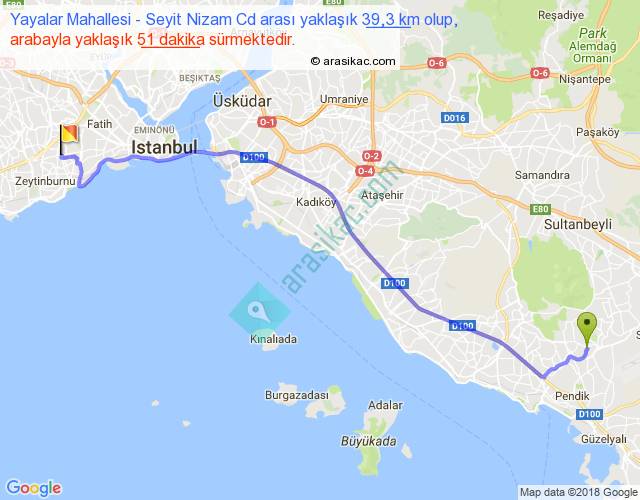 Yayalar Mahallesi - Seyit Nizam Cd arası yaklaşık olarak 90 km/h ile yukarıda belirtilen sürede olup, iki yerin kuş uçuşu uzaklığı (mesafesi) 32'dir. Yolculuk otobüsle 1 saat 6 dakika sürmektedir.