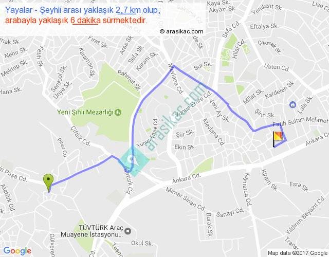 Yayalar - Şeyhli arası yaklaşık olarak 90 km/h ile yukarıda belirtilen sürede olup, iki yerin kuş uçuşu uzaklığı (mesafesi) 2'dir. Yolculuk otobüsle 7 dakika sürmektedir.