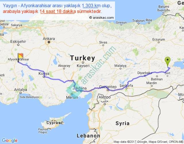 Yaygın - Afyonkarahisar arası yaklaşık olarak 90 km/h ile yukarıda belirtilen sürede olup, iki yerin kuş uçuşu uzaklığı (mesafesi) 986'dir. Eğer belirtilen yerler arasında uçak seferi var ise bu süre uçakla 1 saat 31 dakika'ya kadar düşebilir. Yolculuk otobüsle 18 saat 35 dakika sürmektedir.