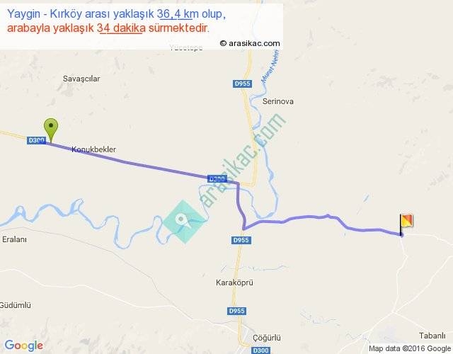 Yaygin - Kırköy arası yaklaşık olarak 90 km/h ile yukarıda belirtilen sürede olup, iki yerin kuş uçuşu uzaklığı (mesafesi) 30'dir. Yolculuk otobüsle 44 dakika sürmektedir.