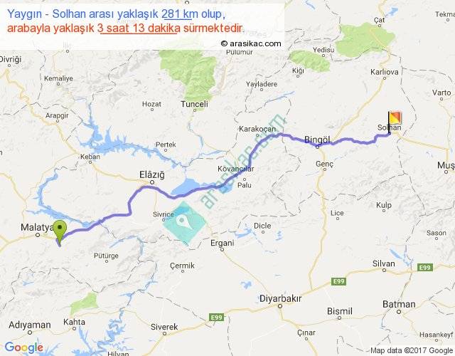 Yaygın - Solhan arası yaklaşık olarak 90 km/h ile yukarıda belirtilen sürede olup, iki yerin kuş uçuşu uzaklığı (mesafesi) 232'dir. Yolculuk otobüsle 4 saat 10 dakika sürmektedir.