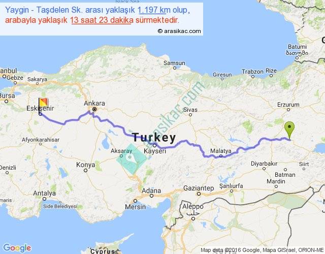 Yaygin - Taşdelen Sk. arası yaklaşık olarak 90 km/h ile yukarıda belirtilen sürede olup, iki yerin kuş uçuşu uzaklığı (mesafesi) 930'dir. Eğer belirtilen yerler arasında uçak seferi var ise bu süre uçakla 1 saat 25 dakika'ya kadar düşebilir. Yolculuk otobüsle 17 saat 23 dakika sürmektedir.