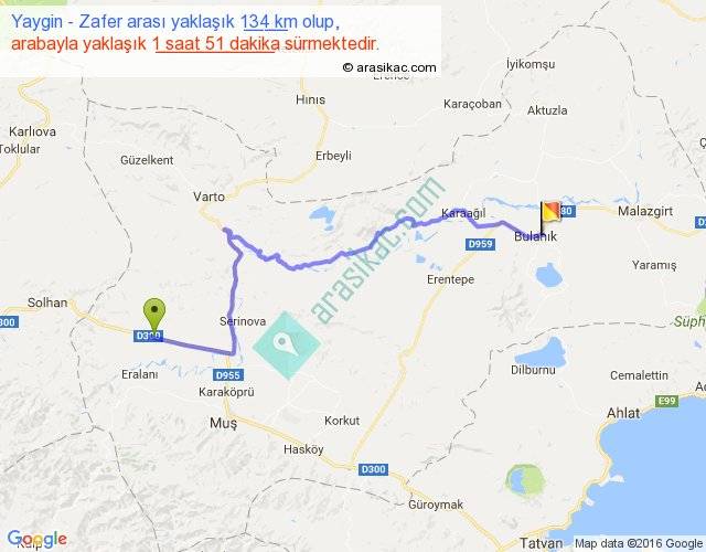 Yaygin - Zafer arası yaklaşık olarak 90 km/h ile yukarıda belirtilen sürede olup, iki yerin kuş uçuşu uzaklığı (mesafesi) 86'dir. Yolculuk otobüsle 2 saat 24 dakika sürmektedir.