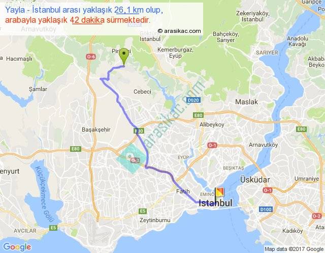 Yayla - İstanbul arası yaklaşık olarak 90 km/h ile yukarıda belirtilen sürede olup, iki yerin kuş uçuşu uzaklığı (mesafesi) 19'dir. Yolculuk otobüsle 54 dakika sürmektedir.