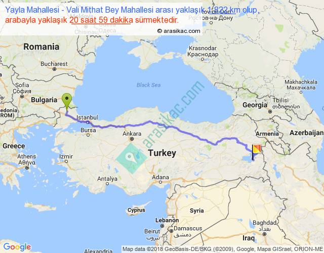 Yayla Mahallesi - Vali Mithat Bey Mahallesi arası yaklaşık olarak 90 km/h ile yukarıda belirtilen sürede olup, iki yerin kuş uçuşu uzaklığı (mesafesi) 1411'dir. Eğer belirtilen yerler arasında uçak seferi var ise bu süre uçakla 2 saat 10 dakika'ya kadar düşebilir. Yolculuk otobüsle 1 gün 3 saat sürmektedir.