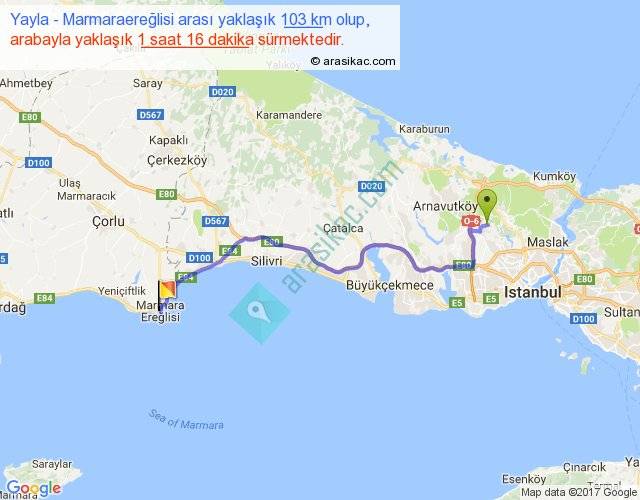 Yayla - Marmaraereğlisi arası yaklaşık olarak 90 km/h ile yukarıda belirtilen sürede olup, iki yerin kuş uçuşu uzaklığı (mesafesi) 78'dir. Yolculuk otobüsle 1 saat 38 dakika sürmektedir.