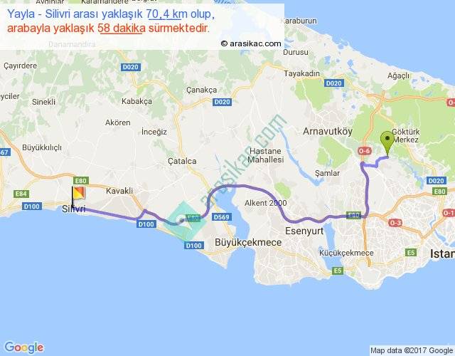 Yayla - Silivri arası yaklaşık olarak 90 km/h ile yukarıda belirtilen sürede olup, iki yerin kuş uçuşu uzaklığı (mesafesi) 51'dir. Yolculuk otobüsle 1 saat 15 dakika sürmektedir.