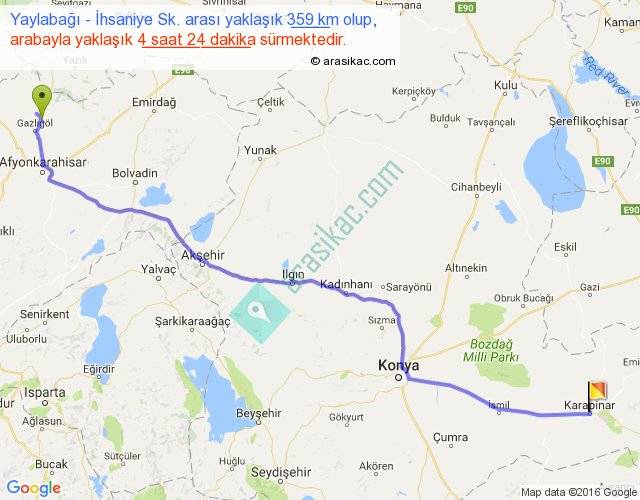 Yaylabağı - İhsaniye Sk. arası yaklaşık olarak 90 km/h ile yukarıda belirtilen sürede olup, iki yerin kuş uçuşu uzaklığı (mesafesi) 295'dir. Eğer belirtilen yerler arasında uçak seferi var ise bu süre uçakla 27 dakika'ya kadar düşebilir. Yolculuk otobüsle 5 saat 43 dakika sürmektedir.