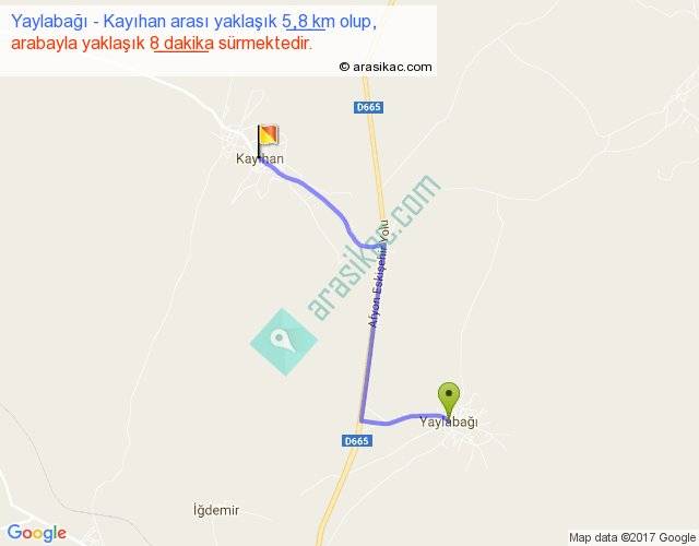 Yaylabağı - Kayıhan arası yaklaşık olarak 90 km/h ile yukarıda belirtilen sürede olup, iki yerin kuş uçuşu uzaklığı (mesafesi) 4'dir. Yolculuk otobüsle 10 dakika sürmektedir.