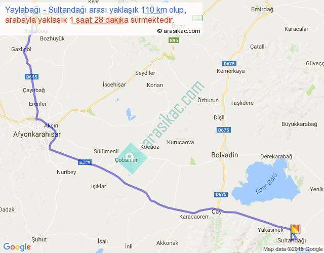 Yaylabağı - Sultandağı arası yaklaşık olarak 90 km/h ile yukarıda belirtilen sürede olup, iki yerin kuş uçuşu uzaklığı (mesafesi) 77'dir. Yolculuk otobüsle 1 saat 54 dakika sürmektedir.