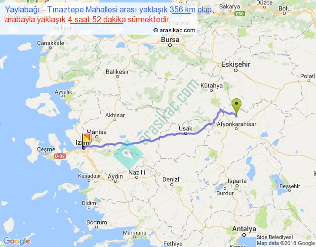 Yaylabağı - Tınaztepe Mahallesi arası yaklaşık olarak 90 km/h ile yukarıda belirtilen sürede olup, iki yerin kuş uçuşu uzaklığı (mesafesi) 301'dir. Eğer belirtilen yerler arasında uçak seferi var ise bu süre uçakla 27 dakika'ya kadar düşebilir. Yolculuk otobüsle 6 saat 19 dakika sürmektedir.