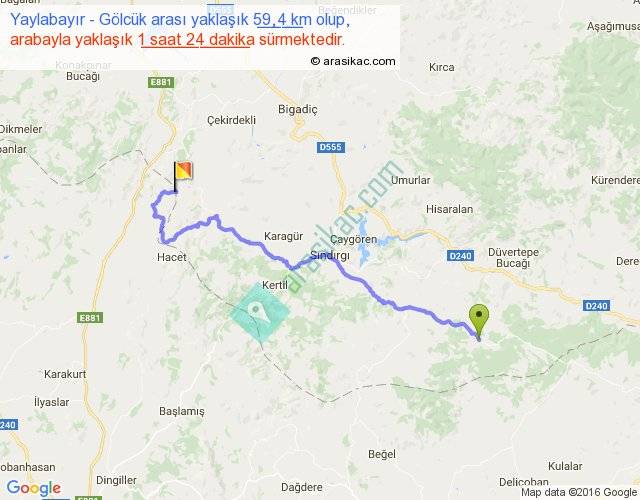 Yaylabayır - Gölcük arası yaklaşık olarak 90 km/h ile yukarıda belirtilen sürede olup, iki yerin kuş uçuşu uzaklığı (mesafesi) 40'dir. Yolculuk otobüsle 1 saat 49 dakika sürmektedir.