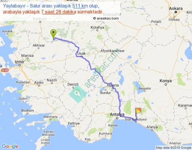Yaylabayır - Salur arası yaklaşık olarak 90 km/h ile yukarıda belirtilen sürede olup, iki yerin kuş uçuşu uzaklığı (mesafesi) 361'dir. Eğer belirtilen yerler arasında uçak seferi var ise bu süre uçakla 33 dakika'ya kadar düşebilir. Yolculuk otobüsle 9 saat 42 dakika sürmektedir.