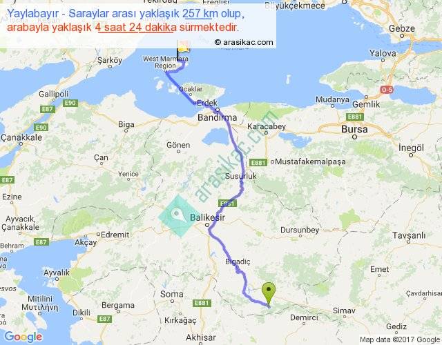 Yaylabayır - Saraylar arası yaklaşık olarak 90 km/h ile yukarıda belirtilen sürede olup, iki yerin kuş uçuşu uzaklığı (mesafesi) 177'dir. Yolculuk otobüsle 5 saat 43 dakika sürmektedir.