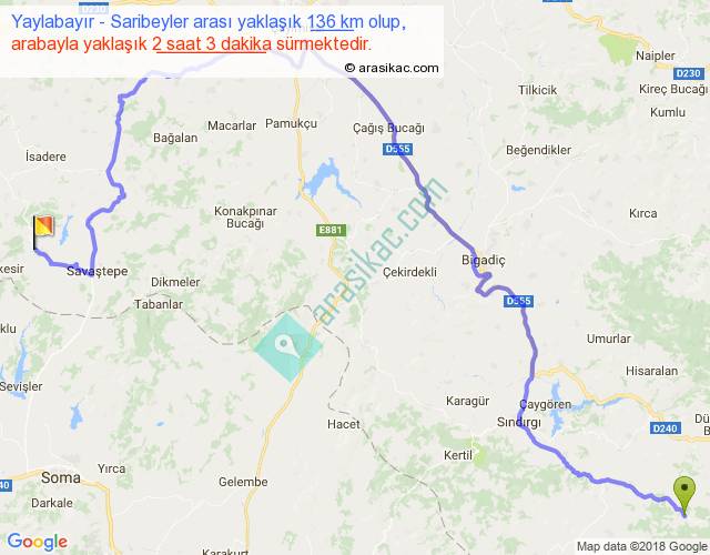 Yaylabayır - Saribeyler arası yaklaşık olarak 90 km/h ile yukarıda belirtilen sürede olup, iki yerin kuş uçuşu uzaklığı (mesafesi) 74'dir. Yolculuk otobüsle 2 saat 39 dakika sürmektedir.