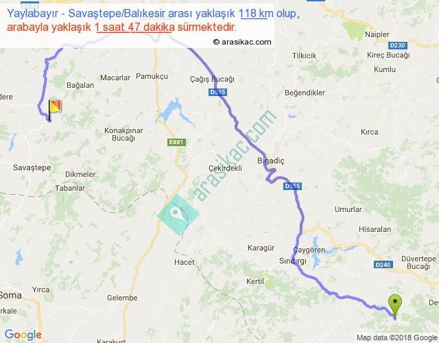 Yaylabayır - Savaştepe Balıkesir arası yaklaşık olarak 90 km/h ile yukarıda belirtilen sürede olup, iki yerin kuş uçuşu uzaklığı (mesafesi) 68'dir. Yolculuk otobüsle 2 saat 19 dakika sürmektedir.