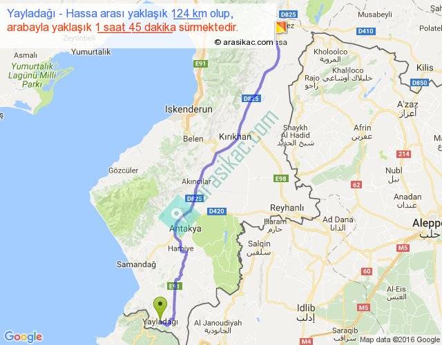 Yayladağı - Hassa arası yaklaşık olarak 90 km/h ile yukarıda belirtilen sürede olup, iki yerin kuş uçuşu uzaklığı (mesafesi) 107'dir. Yolculuk otobüsle 2 saat 16 dakika sürmektedir.