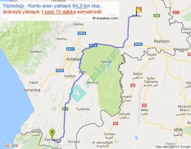 Yayladağı - Kumlu arası yaklaşık olarak 90 km/h ile yukarıda belirtilen sürede olup, iki yerin kuş uçuşu uzaklığı (mesafesi) 62'dir. Yolculuk otobüsle 1 saat 37 dakika sürmektedir.