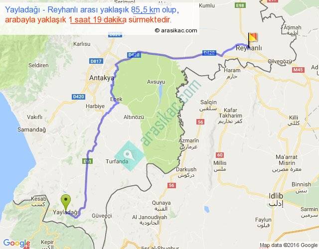 Yayladağı - Reyhanlı arası yaklaşık olarak 90 km/h ile yukarıda belirtilen sürede olup, iki yerin kuş uçuşu uzaklığı (mesafesi) 61'dir. Yolculuk otobüsle 1 saat 42 dakika sürmektedir.