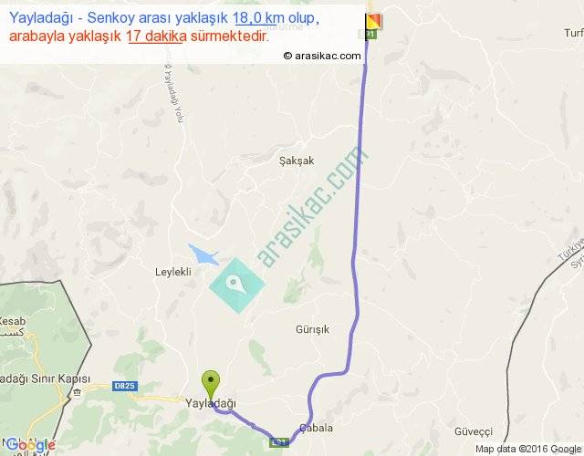 Yayladağı - Senkoy arası yaklaşık olarak 90 km/h ile yukarıda belirtilen sürede olup, iki yerin kuş uçuşu uzaklığı (mesafesi) 13'dir. Yolculuk otobüsle 22 dakika sürmektedir.