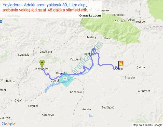 Yayladere - Adaklı arası yaklaşık olarak 90 km/h ile yukarıda belirtilen sürede olup, iki yerin kuş uçuşu uzaklığı (mesafesi) 35'dir. Yolculuk otobüsle 2 saat 20 dakika sürmektedir.