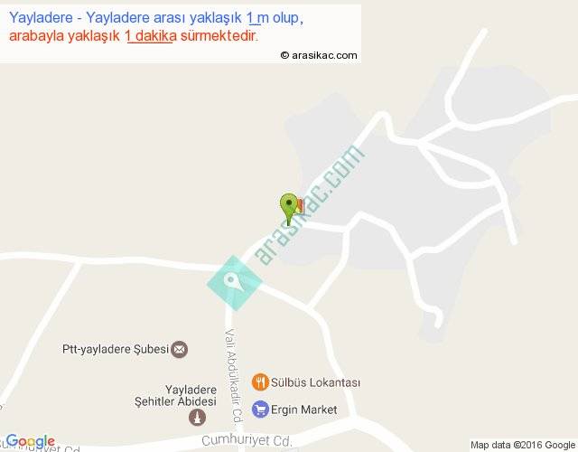Yayladere - Yayladere arası yaklaşık olarak 90 km/h ile yukarıda belirtilen sürede olup, iki yerin kuş uçuşu uzaklığı (mesafesi) 0'dir. Yolculuk otobüsle 1 dakika sürmektedir.