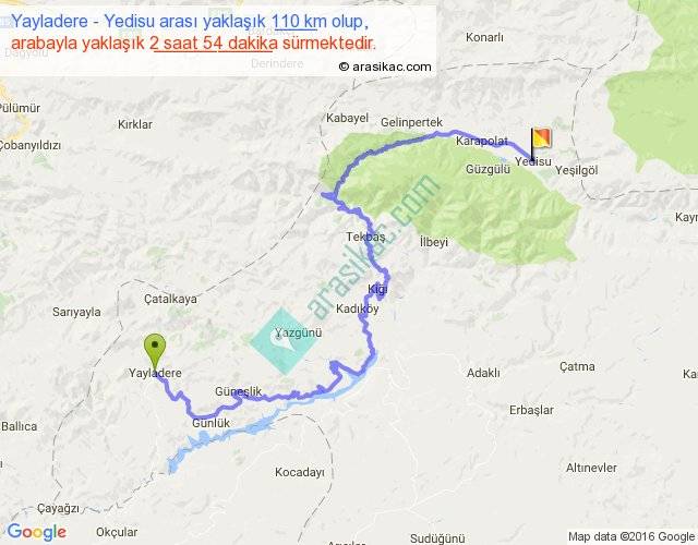 Yayladere - Yedisu arası yaklaşık olarak 90 km/h ile yukarıda belirtilen sürede olup, iki yerin kuş uçuşu uzaklığı (mesafesi) 47'dir. Yolculuk otobüsle 3 saat 46 dakika sürmektedir.