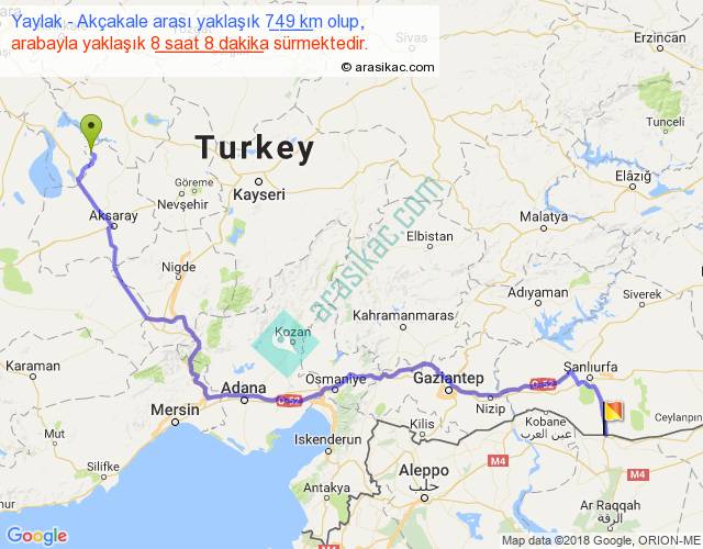 Yaylak - Akçakale arası yaklaşık olarak 90 km/h ile yukarıda belirtilen sürede olup, iki yerin kuş uçuşu uzaklığı (mesafesi) 511'dir. Eğer belirtilen yerler arasında uçak seferi var ise bu süre uçakla 47 dakika'ya kadar düşebilir. Yolculuk otobüsle 10 saat 34 dakika sürmektedir.